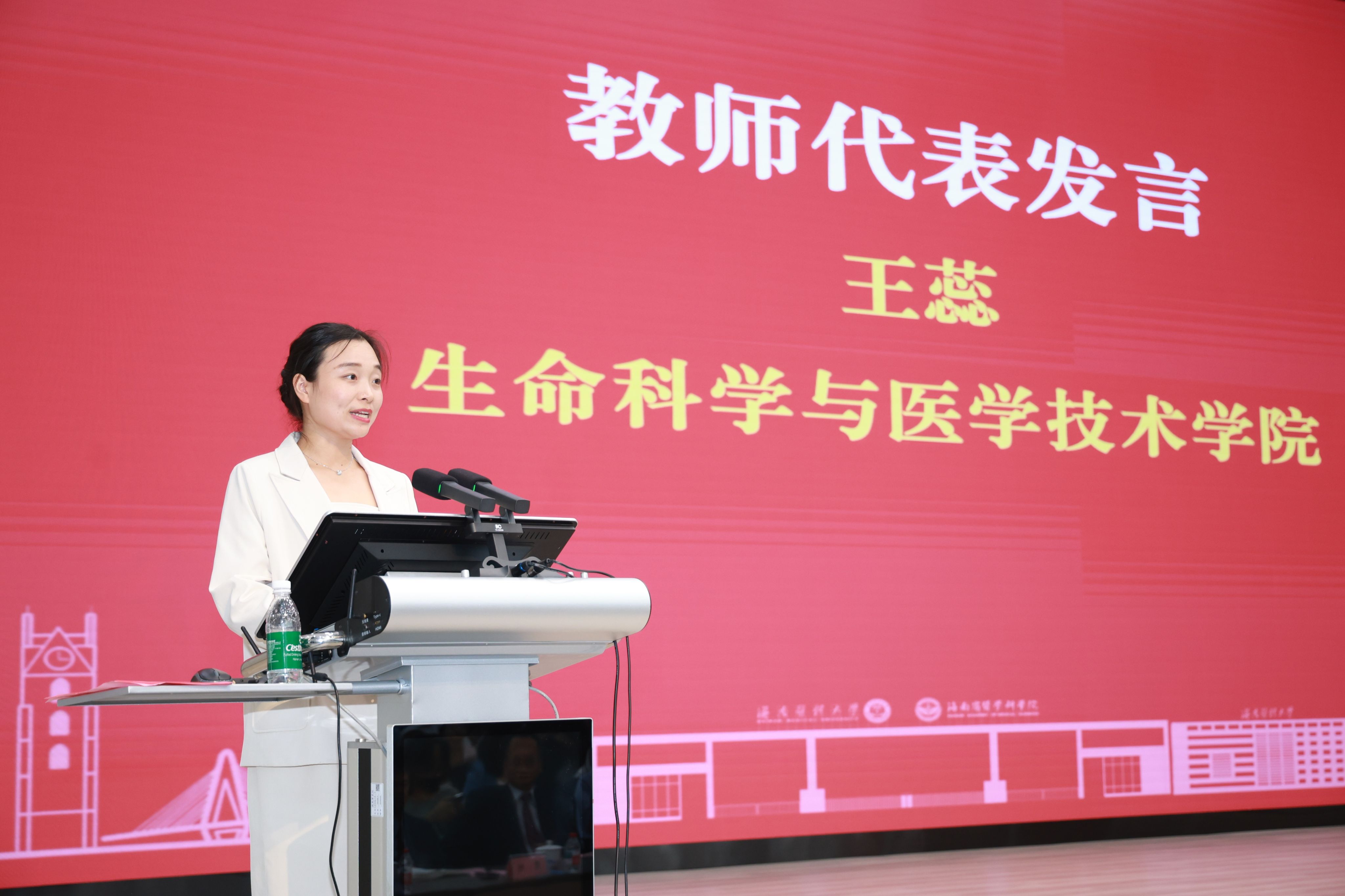生命科学与医学技术学院教师王蕊作为教师代表发言。她表示,学校在深化改革中已然形成了“前沿可见、团队协作、有人点拨”的良好科研生态,助力她实现了科研和教学双向发展。未来,她希望与同事们一道继续扎根海南,服务“国家所需、医学所向、学校所长、学生所盼”。