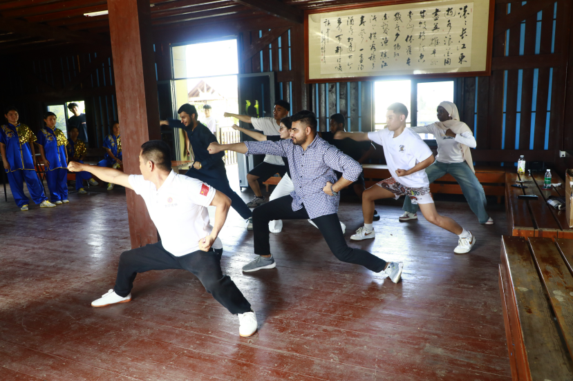 万宁曲冲村,非遗传承人翁海县带领留学生练习“猛虎下山拳”