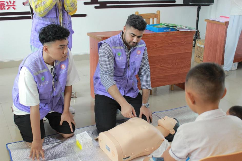 医疗惠民实践中,团队成员在万宁市人民医院开展双语导诊服务,有效缓解涉外就医沟通难题;同时走进曲冲村和龙滚镇村民及留守儿童提供CPR急救培训,提升基层民众自救互救能力。