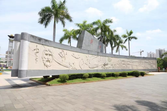 医学卷轴以希波克拉底和神农氏像象征中西医融合,两侧绘有星辰、天使、火、龙等元素,寓意人类繁衍与文明进程。中间饰以显微镜、药碾及太阳,体现医学传承与自然共生。主图以海浪、椰树、帆船等南海风貌,彰显学校的地域特色和海医精神。