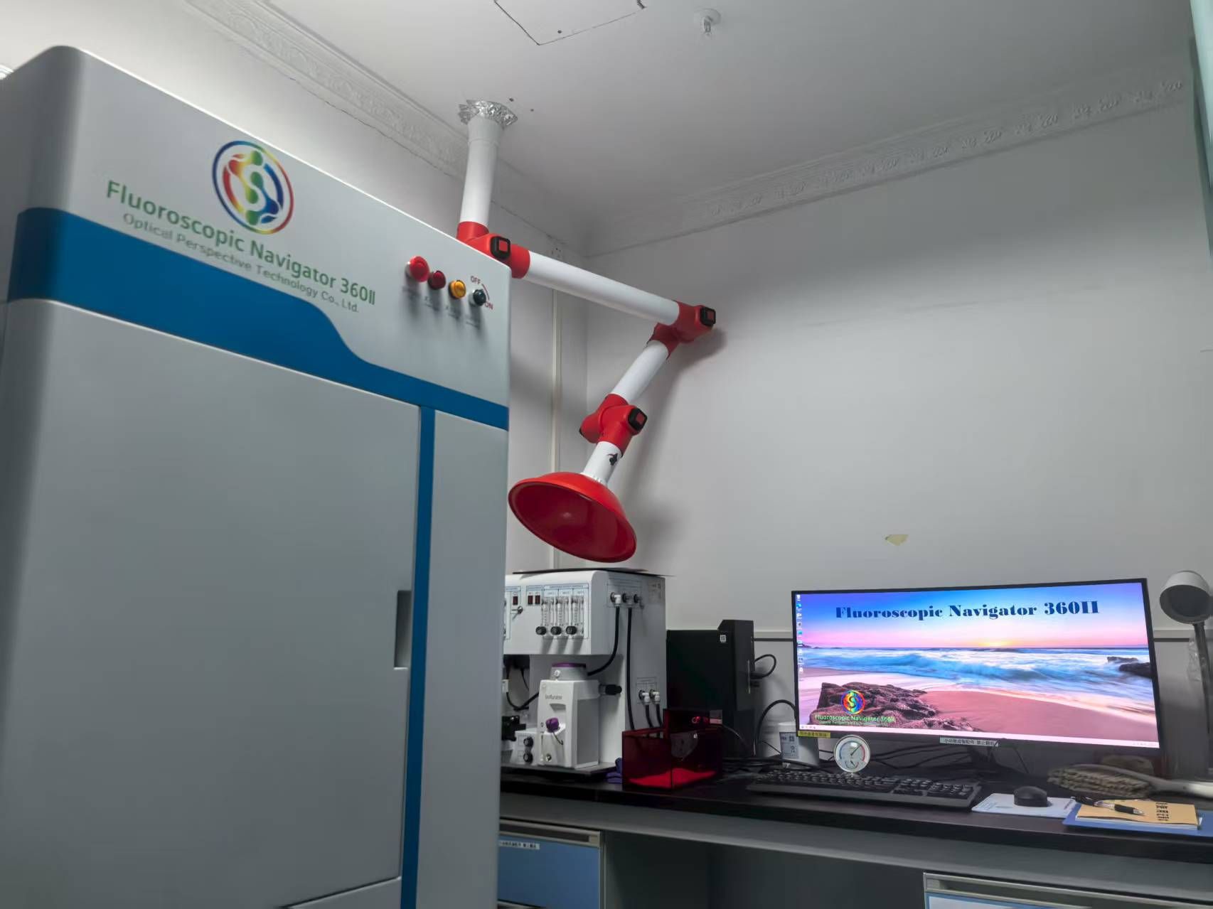 从实验到自主研发技术设备,团队研发制作了分子影像技术设备“活体荧光成像系统Fluoroscopic Navigator 360II”。该设备是一款集成了可见光、近红外一区及二区(NIR-II,1000-1700nm)荧光成像与数字X光成像功能的高端临床前研究设备,能实现荧光信号与解剖结构的精准共定位与组织重构,目前正在与企业合作推进产业化落地。