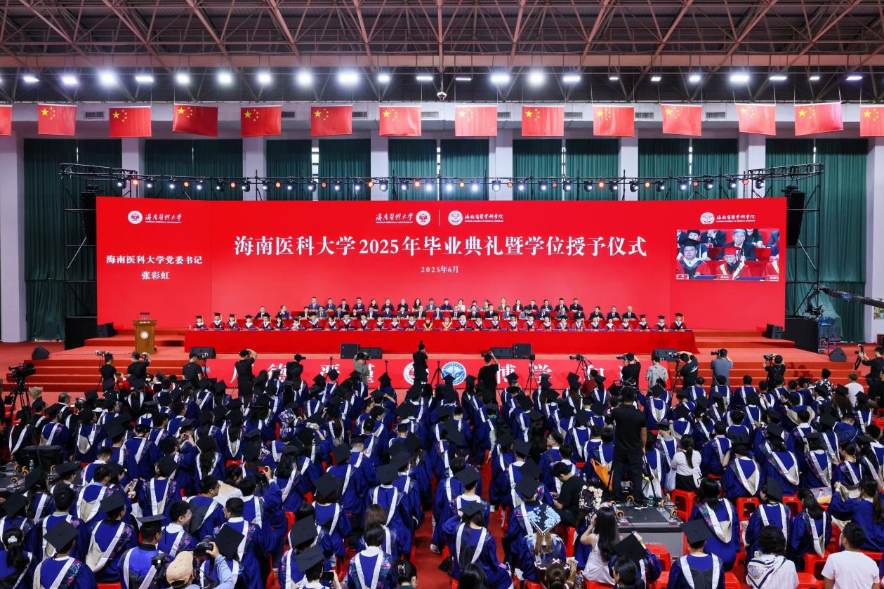 6月28日上午9时,海南医科大学2025年毕业典礼暨学位授予仪式在子文体育馆盛大举行。党委书记张彩虹、校长陈国强等全体党政领导、老领导代表、校友代表、教师代表、毕业生家长代表、学位评定委员会委员以及普招2025届全体研究生,本、专科毕业生出席典礼。张彩虹主持典礼。