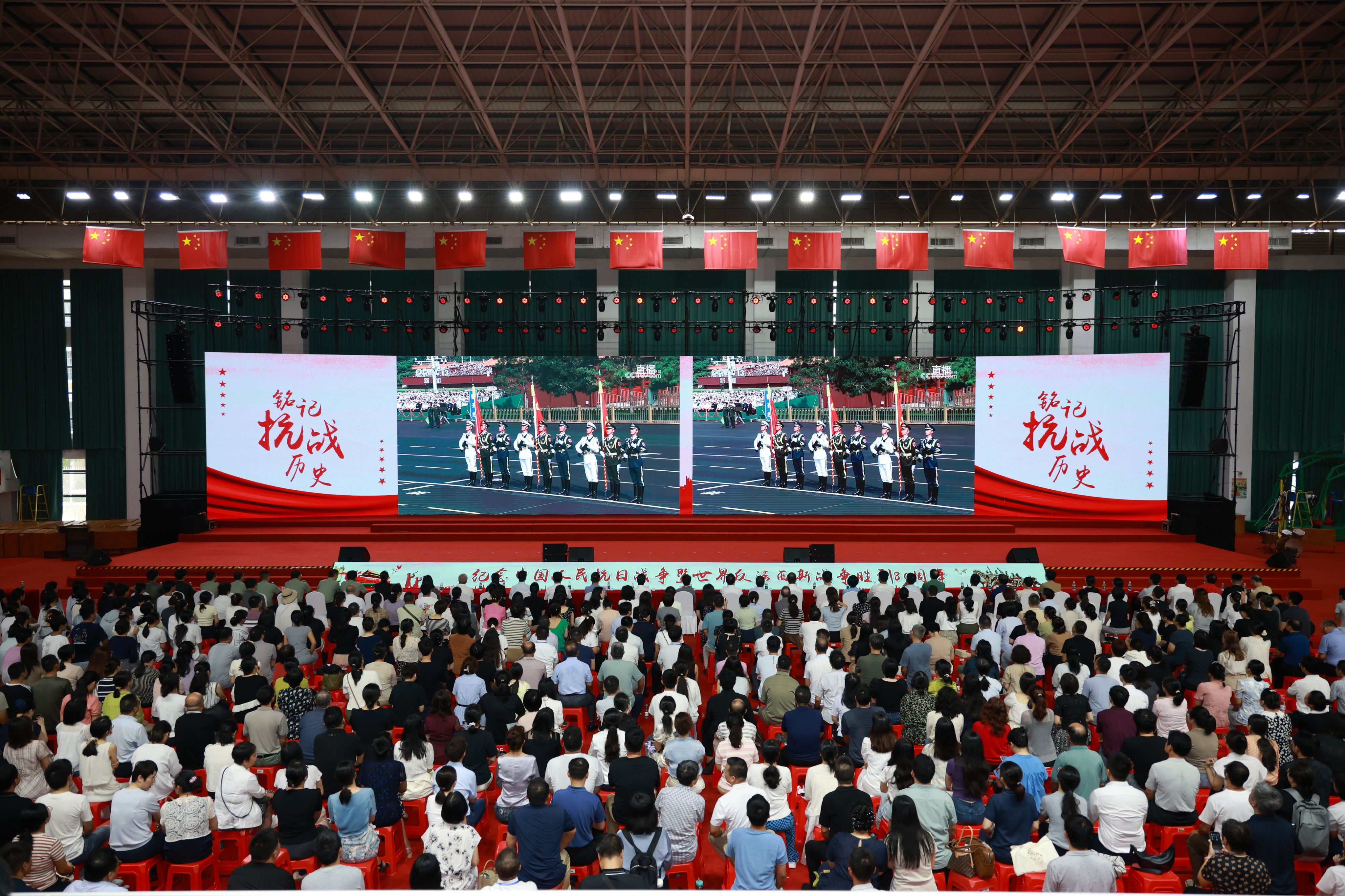 9月3日上午,子文体育馆内气氛庄重而热烈,全校师生齐聚一堂,收看纪念中国人民抗日战争暨世界反法西斯战争胜利80周年阅兵式直播。当听到习近平总书记宣布“今天,我们隆重集会,纪念中国人民抗日战争暨世界反法西斯战争胜利80周年,共同铭记历史、缅怀先烈、珍爱和平、开创未来”时,不少师生悄悄挺直了脊背,眼神里满是肃穆。当天安门广场的画面完整铺展在大屏上,现场掌声此起彼伏,自豪之情清晰地写在每个人脸上。