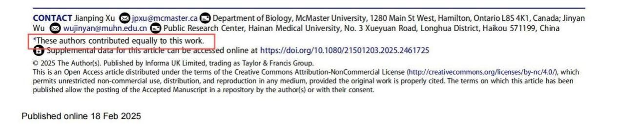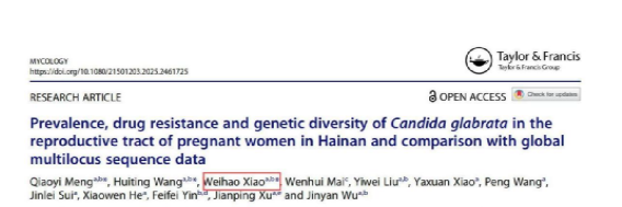 2月,我校急诊创伤学院2021级本科生肖炜豪在科学实验中心吴金燕研究员和麦克马斯特大学生物系徐建平教授的指导下,以共同第一作者的身份在中国科学院二区期刊《Mycology》(IF=4.6)发表题为“Prevalence, drug resistance and genetic diversity of Candida glabrata in the reproductive tract of pregnant women in Hainan and comparison with global multilocus sequence data”(海南孕妇生殖道光滑念珠菌流行性、耐药性、遗传多样性及与全球多位点序列的比较)的研究性文章。