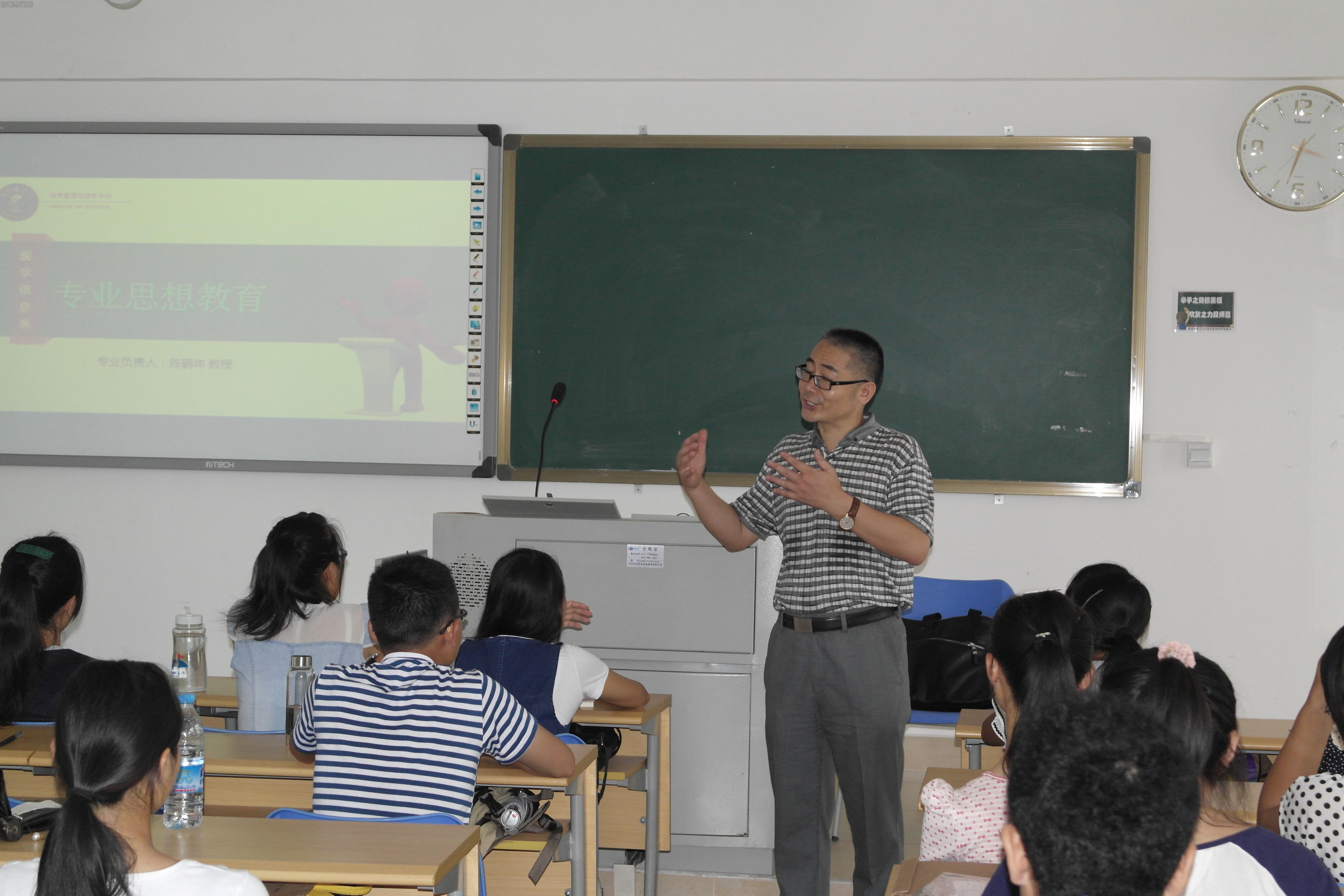 为使新生深入了解所学专业,激发他们的学习热情,9月18日下午,信息技术部(医学信息系)在4-301教室举行了专业思想教育讲座。讲座由系专业负责人陈鹤年教授主讲。系党总支赵志勇书记、辅导员吕倜然老师以及2014级全体新生参加了本次讲座。